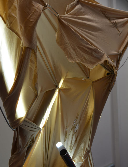 layering of wool and sheer material to sift through the imprints her bodily experiences